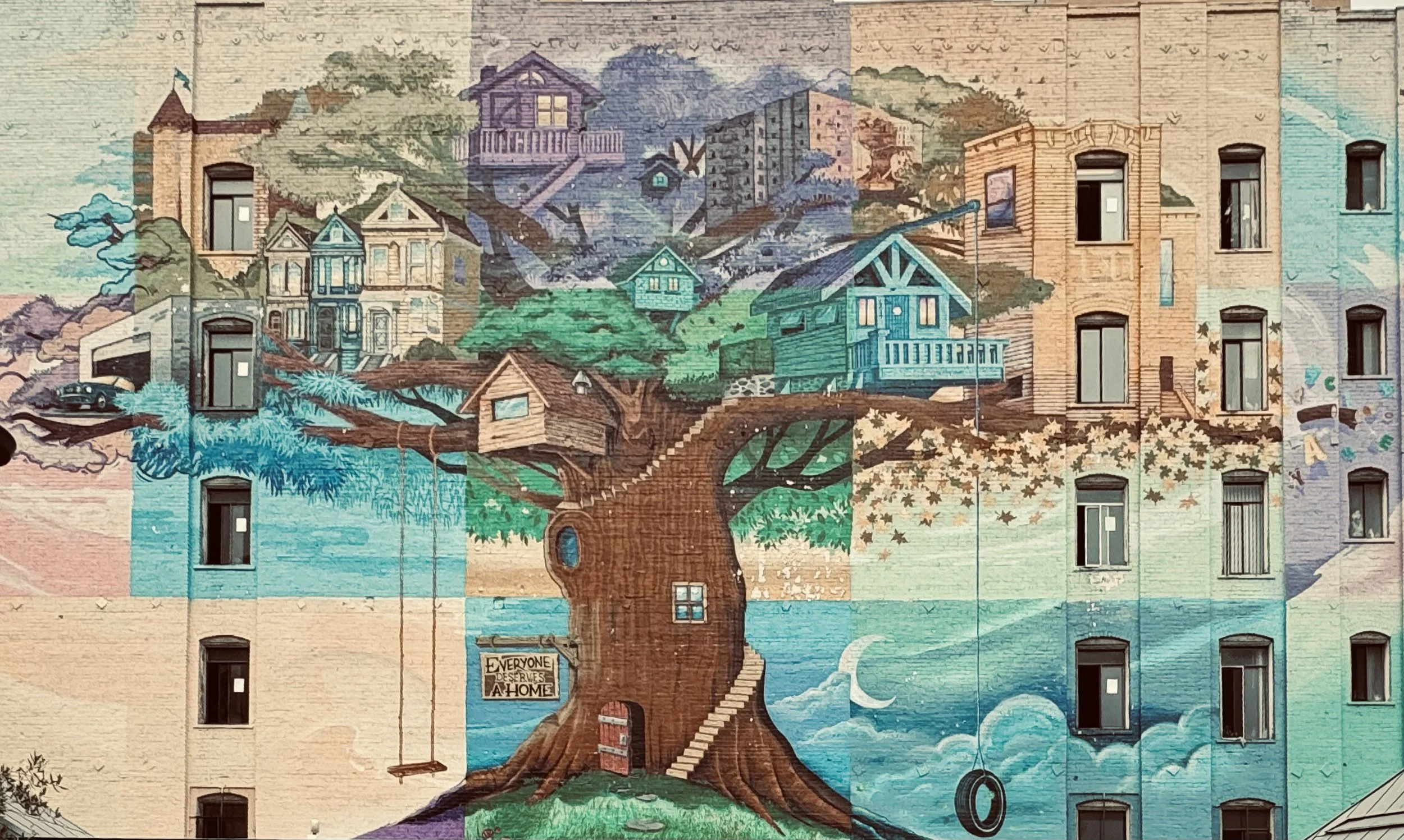 Boedekker Park “Everyone Deserves a Home” Mural in San Francisco, CA. A mural in Windsor Hotel's facade facing Boeddeker Park, was created through months of community outreach and collaboration to create a design truly reflective of the neighborhood.